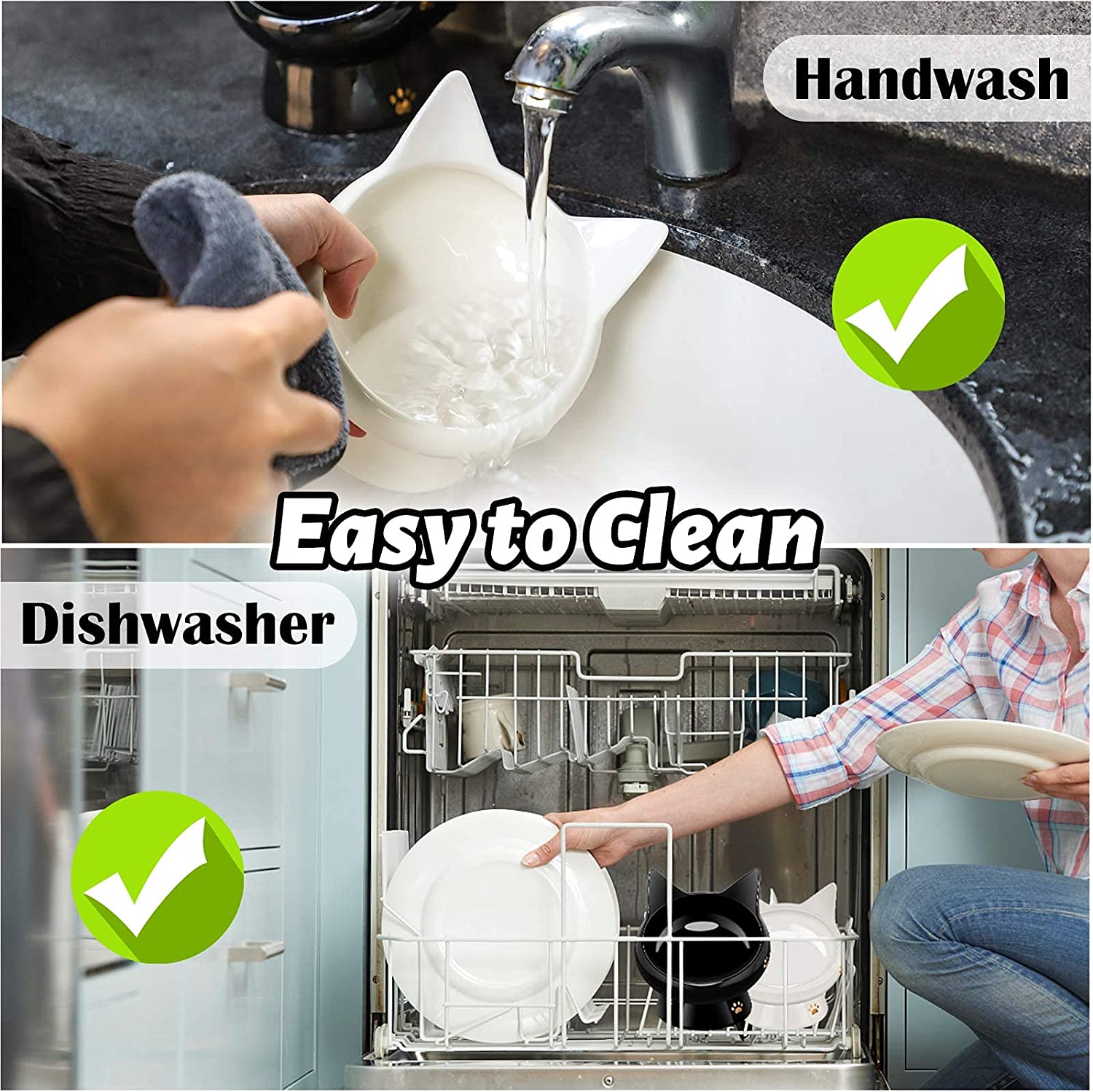 - 【DISHWASHER & MICROWAVE SAFE—EASY TO CLEAN】These 2 pieces raised cat bowls are made of premium pottery; NO chips on the rim, Lead & Cadmium free, Dishwasher and Microwave Safe. It is convenient for you to clean these cat bowls by simply tossing the food bowl and water bowl into the dishwasher and flipping on the switch, especially you have multiple cats!
