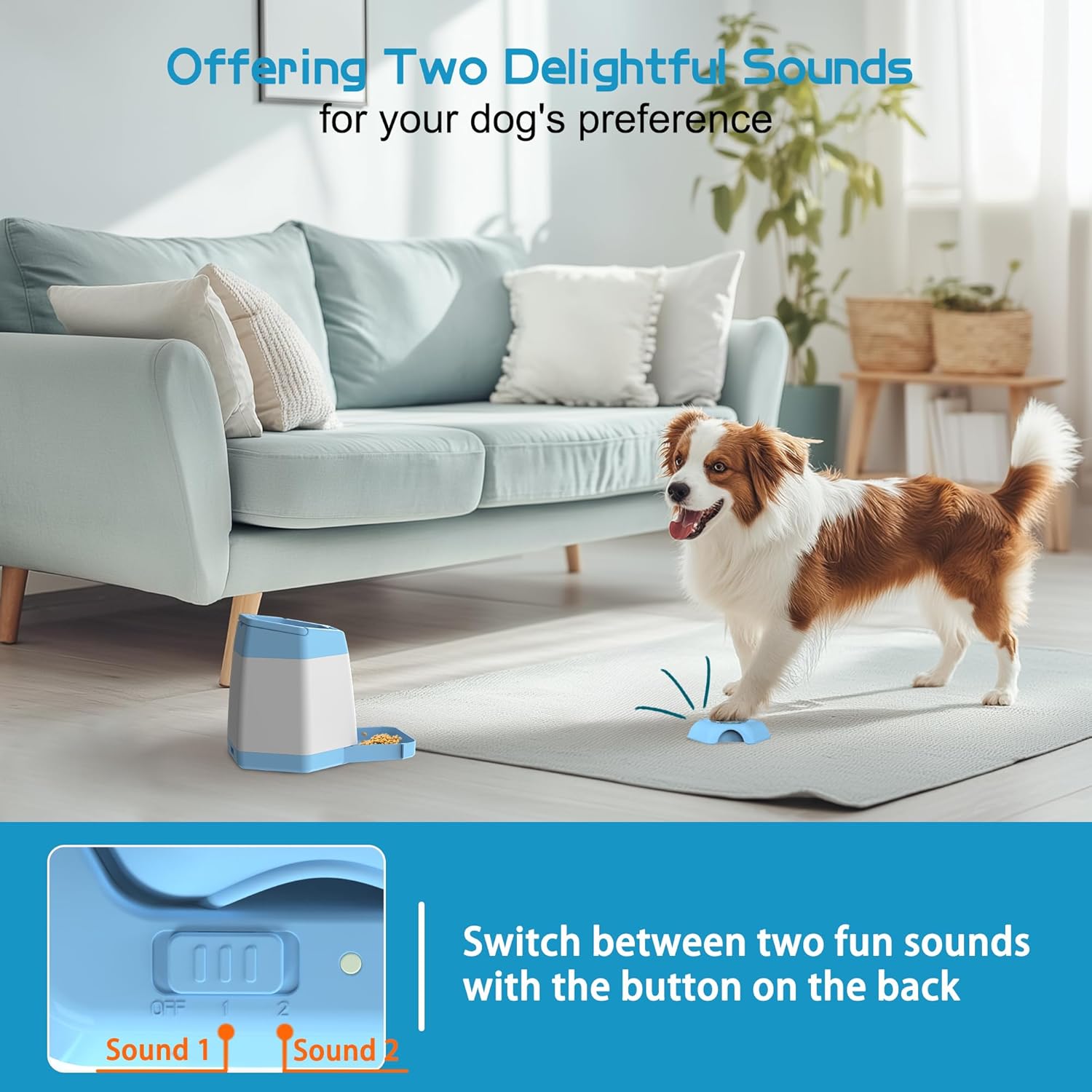 - Dog Toys with Enticing Sounds: Our automatic treat dispenser for dogs features two different sounds to captivate your pet's attention. Simply set the sound effect switch to 1 or 2, and the dog button treat dispenser will emit an enticing sound each time your dog presses it. These sounds mentally stimulate your dog, making playtime more engaging and encouraging longer, more interactive sessions.