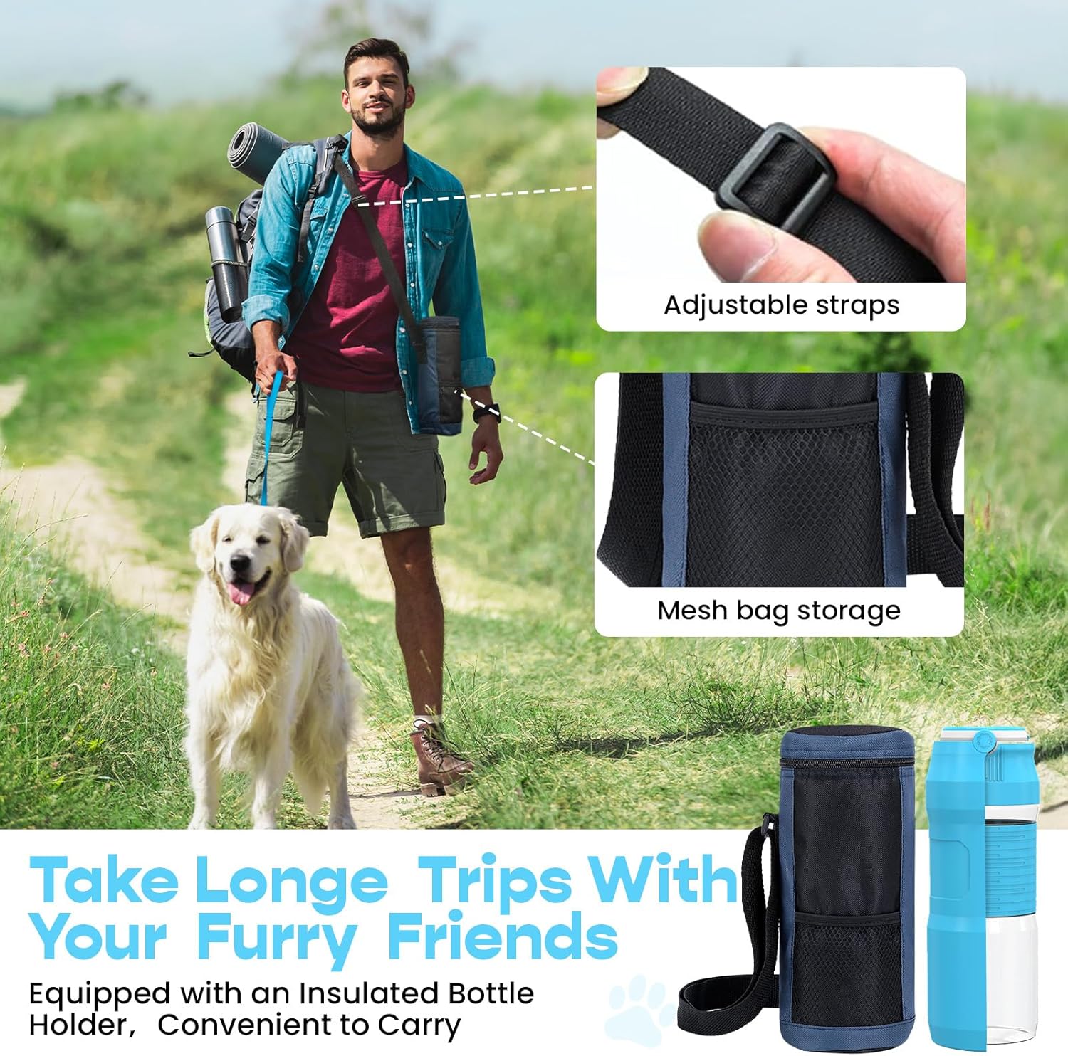 - Easy to Carry: The foldable dog water bottle comes with an Insulated bottle holder, insulated carrier can keep the water cold or warm. It is great for your pet dog or cat when outdoor long walking, running, hiking, traveling or playing, etc. You can put it into the bottle holder, very easy to carry to anywhere you want