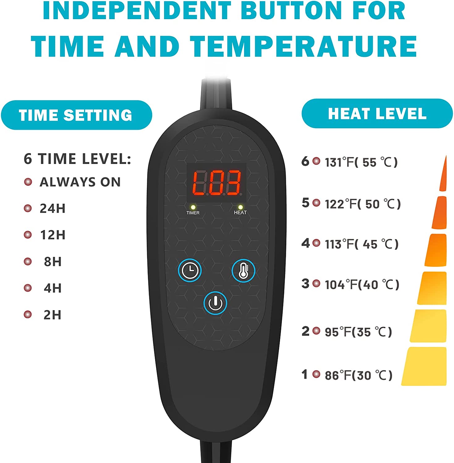 - ✅ 【Outdoor Pet Heating Pad with Timer】: Timer heating pad - Can be placed directly on the ground. Timing system has 6 levels: Always ON(Default Setting, no need to press any button) and 2/4/8/12/24 H(Need press the Timer button). The pad will stop heating when the timer out. and the indicator light moves down automatically when every 4H passed to tell you how much time left.